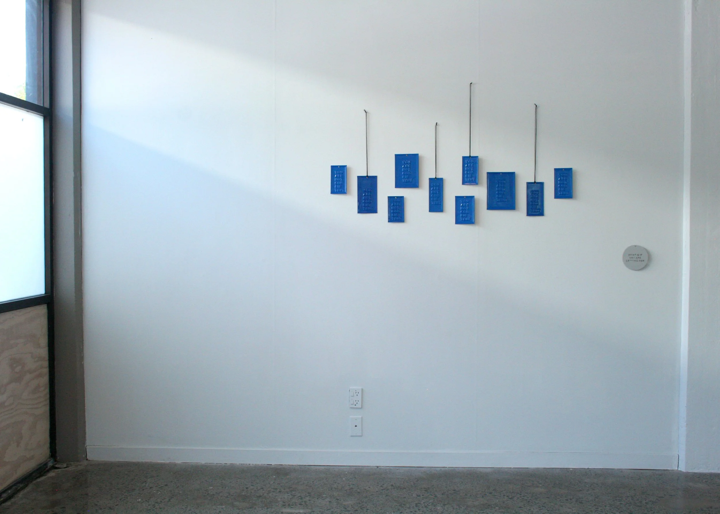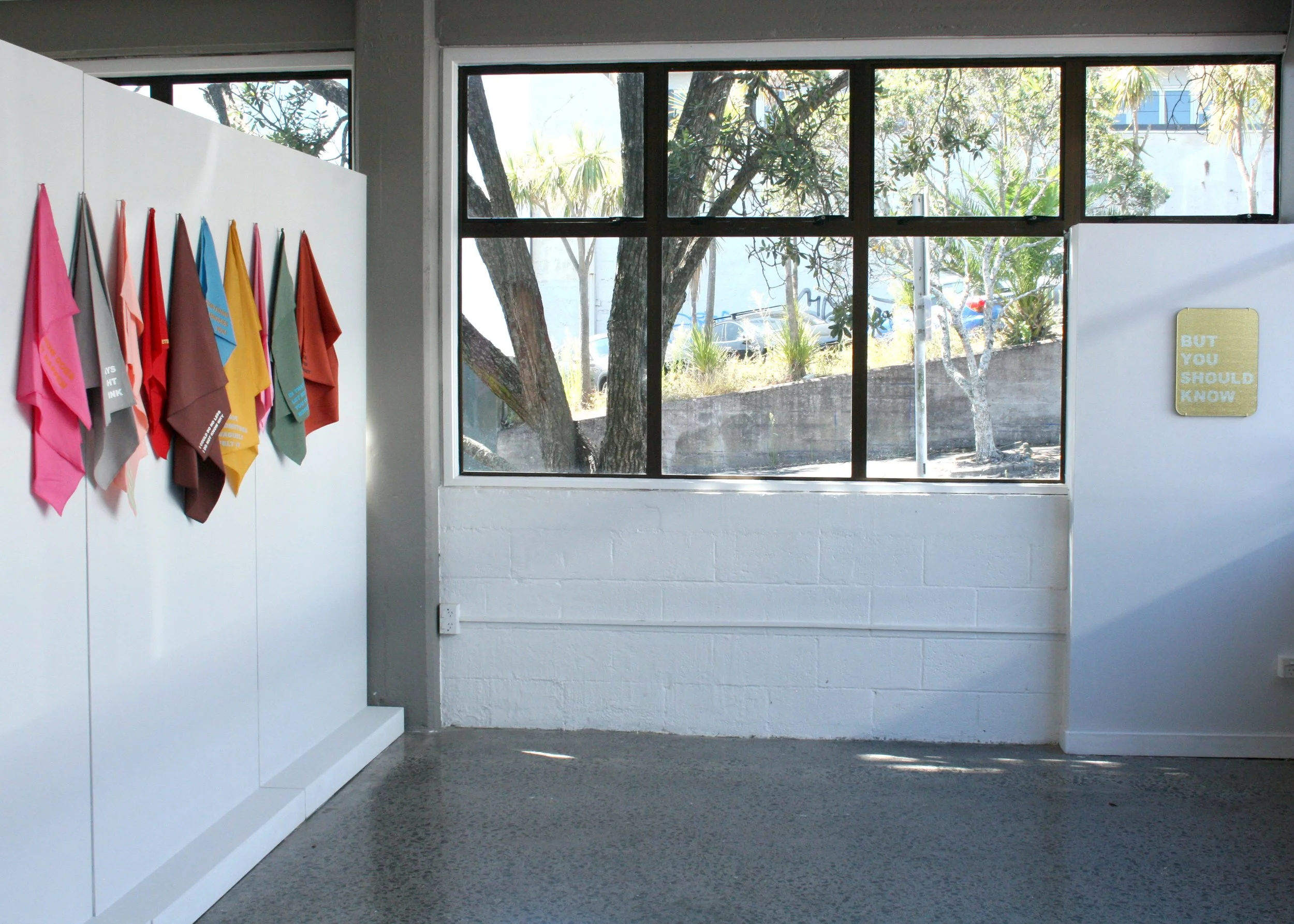 HOW DOES IT HAPPEN is new solo exhibition by Australian artist Zoe Brand. Known for humorous and pithy text-based works, in this exhibition Brand swaps out acrylic and metal for drapey remnant fabrics in her latest series SOFT TEXTS. Oversized brooches/pins tell an uncertain tale. Each fold of fabric anchors a singular statement that loosely converse with the pieces on either side, bouncing back and forth in a conversation between the artist and audience, but whose line is whose? Included in this exhibition are other recent works that help punctuate the comic tragic tale of an artist’s process, or a conversation with a small human or a comment about a world on fire.