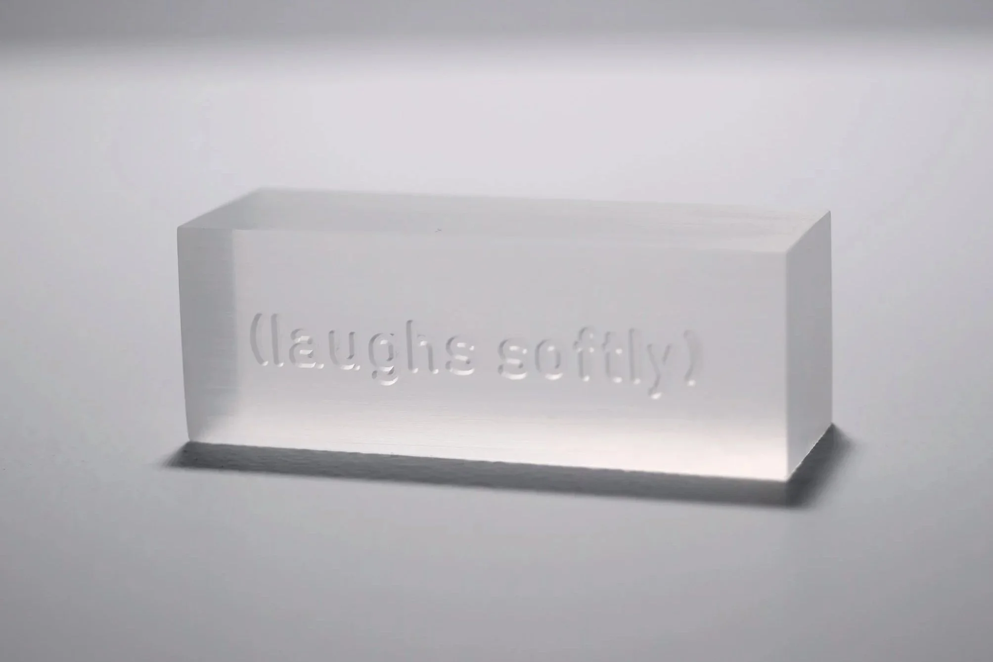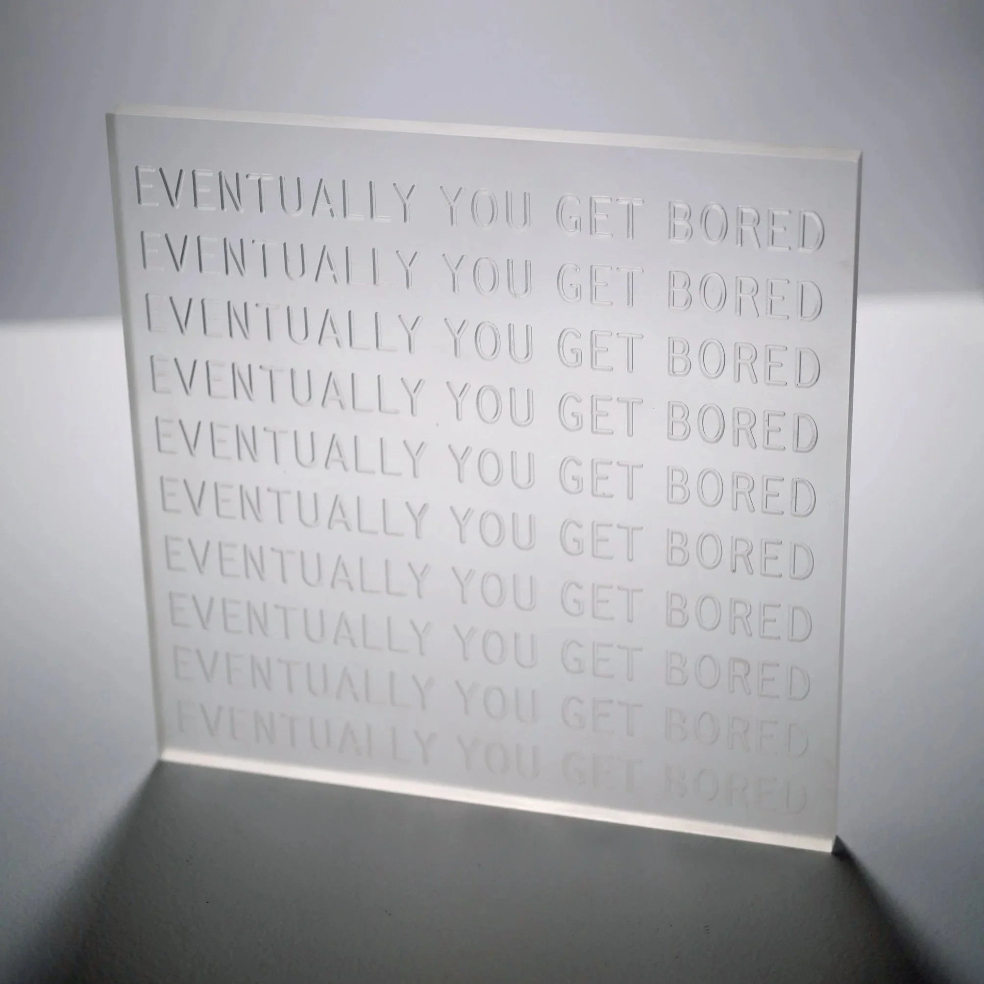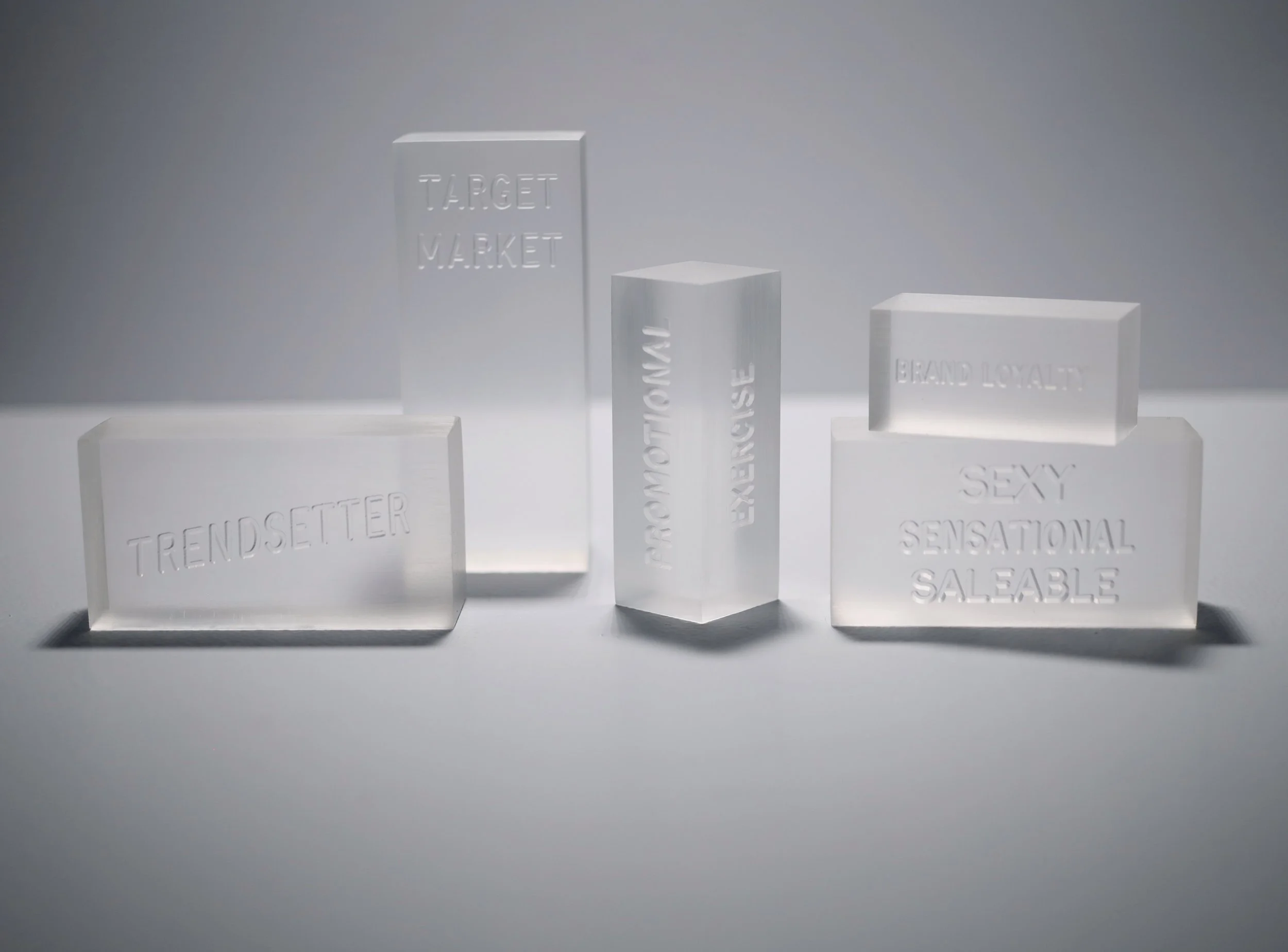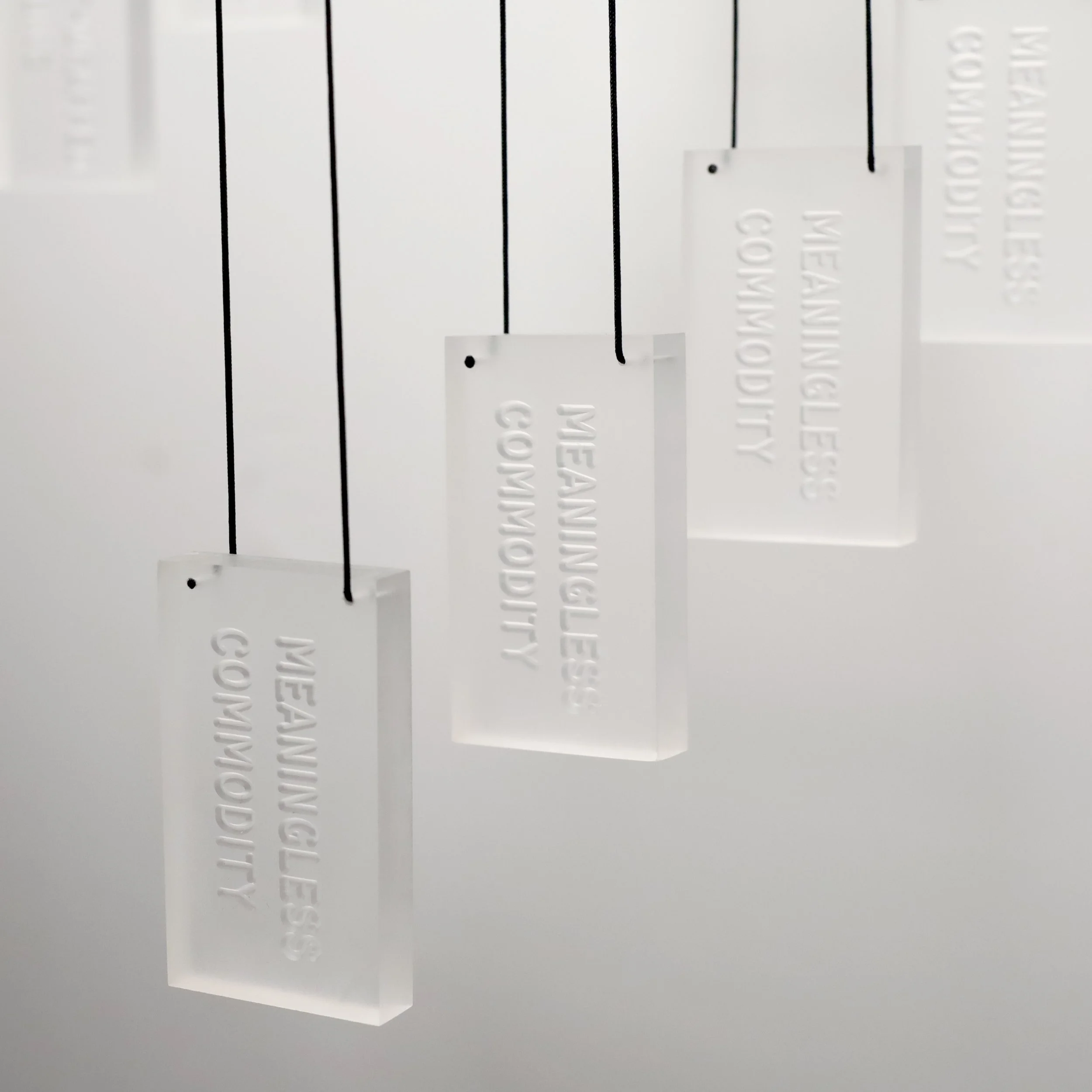 I’ve always been attracted to the language of advertising. Buying a used car, another unnecessary kitchen appliance or a fancy diamond ring the sell is often the same, generic and universal. I love to trawl secondhand online marketplaces not only for the things that are sold, but also the language used to describe it, “not the best quality, but still good”. One such lucky score was a 50kg bulk lot of “frosted perspex blocks, ex-jewellery display. All in good used condition” from a now defunct jewellery store. This find has become the basis of the works in this show.